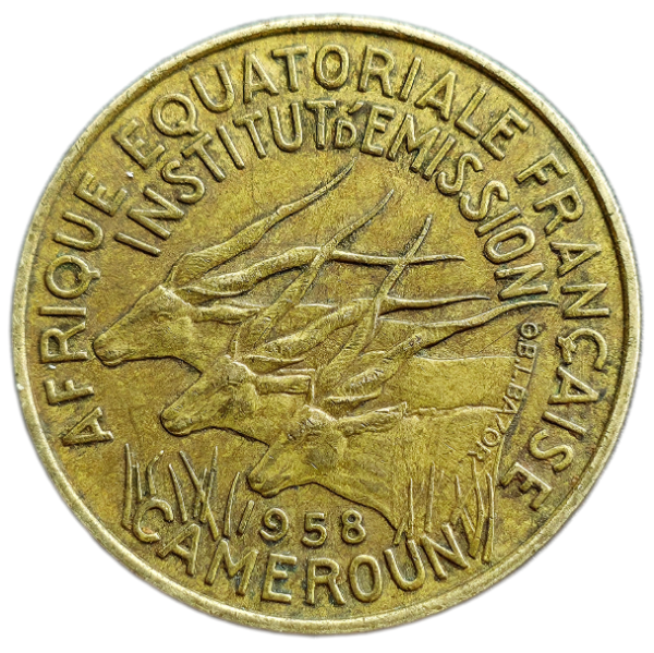 Pieza significativa. Ya que combina los nombres de la África Ecuatorial Francesa (AEF) (una federación de colonias que incluía Gabón, Congo, RCA y Chad) y Camerún (un territorio separado bajo fideicomiso de la ONU administrado por Francia).