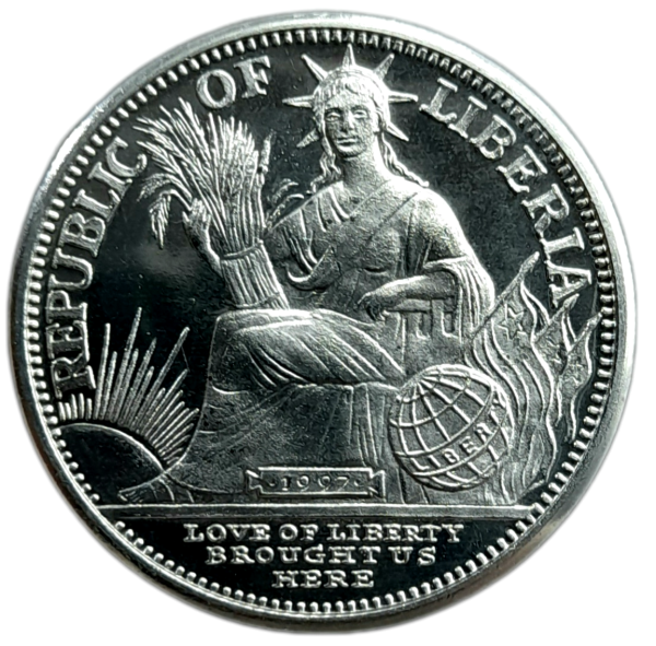 Del otro lado, Libertad sentada con espigas de trigo, banderas, globo terráqueo y sol radiante.
