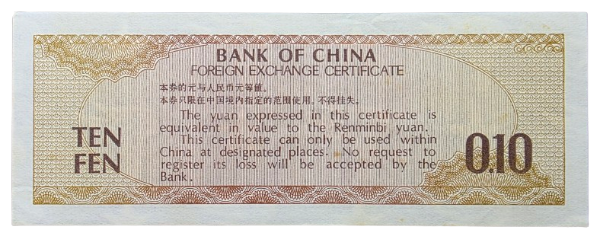 Estos certificados se emitieron para los visitantes extranjeros en China entre las décadas del 80 y 90 ya que no se les permitía usar la moneda local en ese momento.
