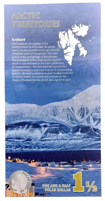 Del otro lado, mapa de Spitsbergen en la esquina superior derecha, foto de un asentamiento ártico debajo.