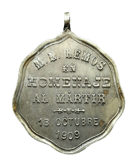 Medalla acuñada en homenaje a Francisco Ferrer Guardia. Librepensador español, pedagogo, anarquista, quien fuera fusilado por un consejo de guerra. Acusado de instigador de los sucesos de la "Semana Trágica" de Barcelona en Julio de 1909. Su condena y posterior ejecución, provocó una oleada de protestas en toda Europa, acabando con el gobierno de Maura.