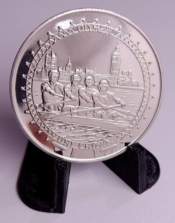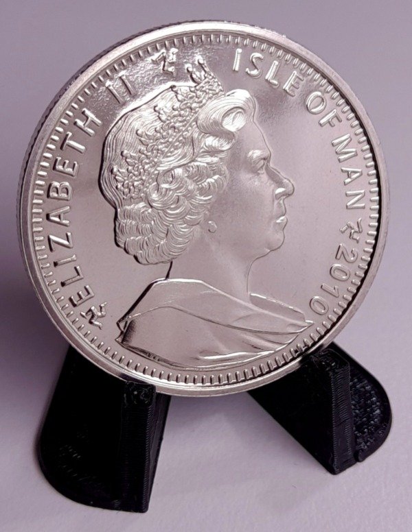 Del otro lado, doble efigie que muestra un retrato de Su Majestad la Reina Isabel II tal como aparece en las monedas actuales.