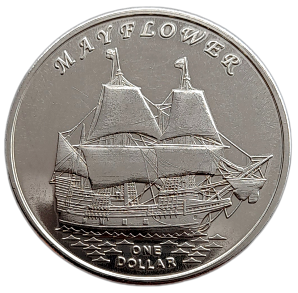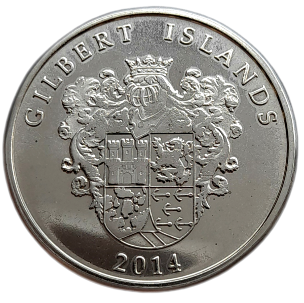 De un lado el imponente navío. Del otro, el Escudo de Armas de las Islas Gilbert.