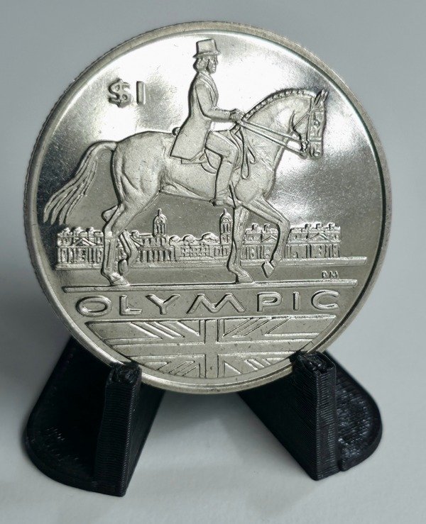 Jinete y caballo cabalgando. Detrás el Palacio del Parlamento. Debajo la palabra Olímpico.
